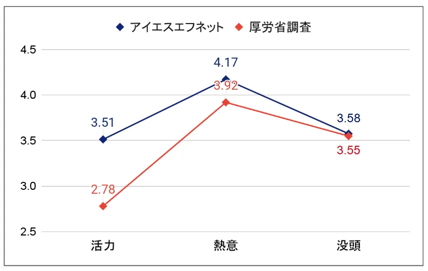 調査結果では、まず「ワークエンゲージメント」における活力、熱意、没頭のすべての項目で、厚生労働省が発表した調査結果を上回るスコアを記録しました。特に「活力」については、国の平均を大きく上回り、社員が職場で活き活きと働いていることが示されています。この高いエンゲージメントは、アイエスエフネットの企業文化が影響していると考えられます。