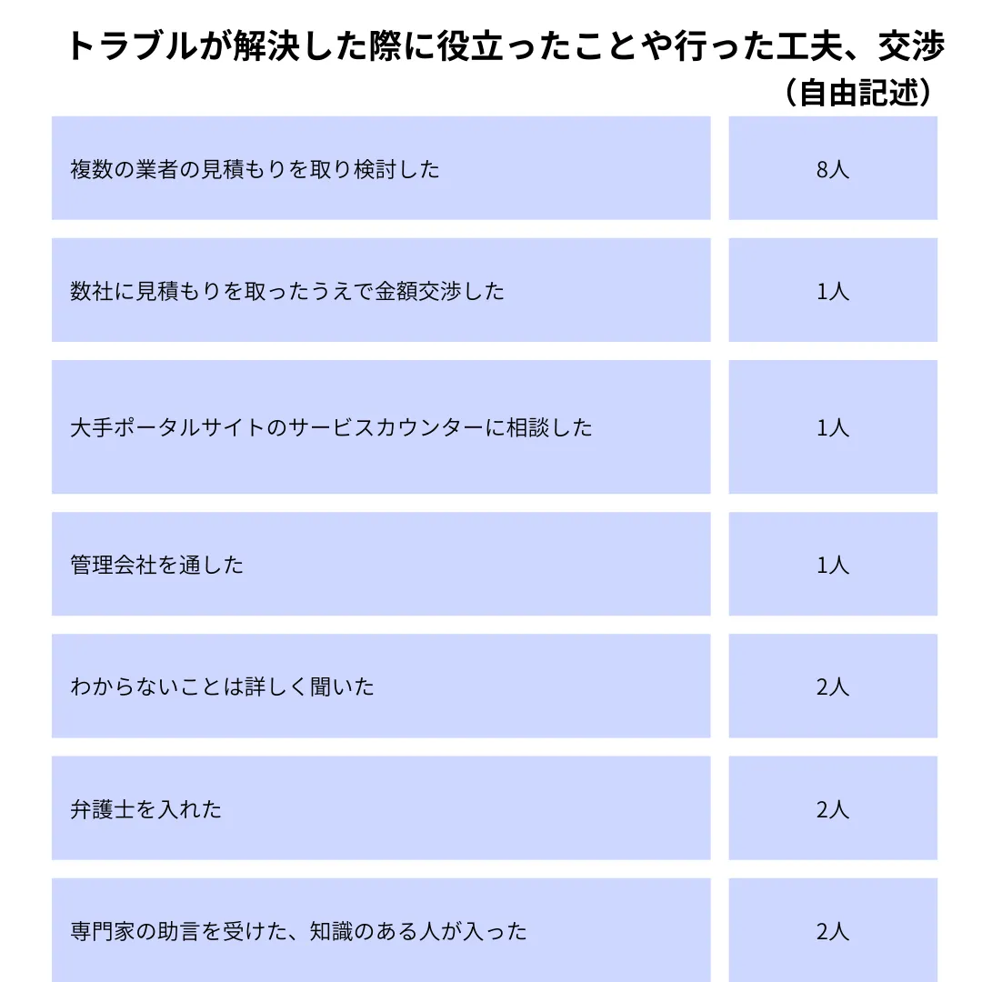 リースバックにおけるトラブルの解決において多くの人が行った手法は、複数の業者との比較検討でした。また、専門家に相談することで問題を解決できたとの声もあります。
