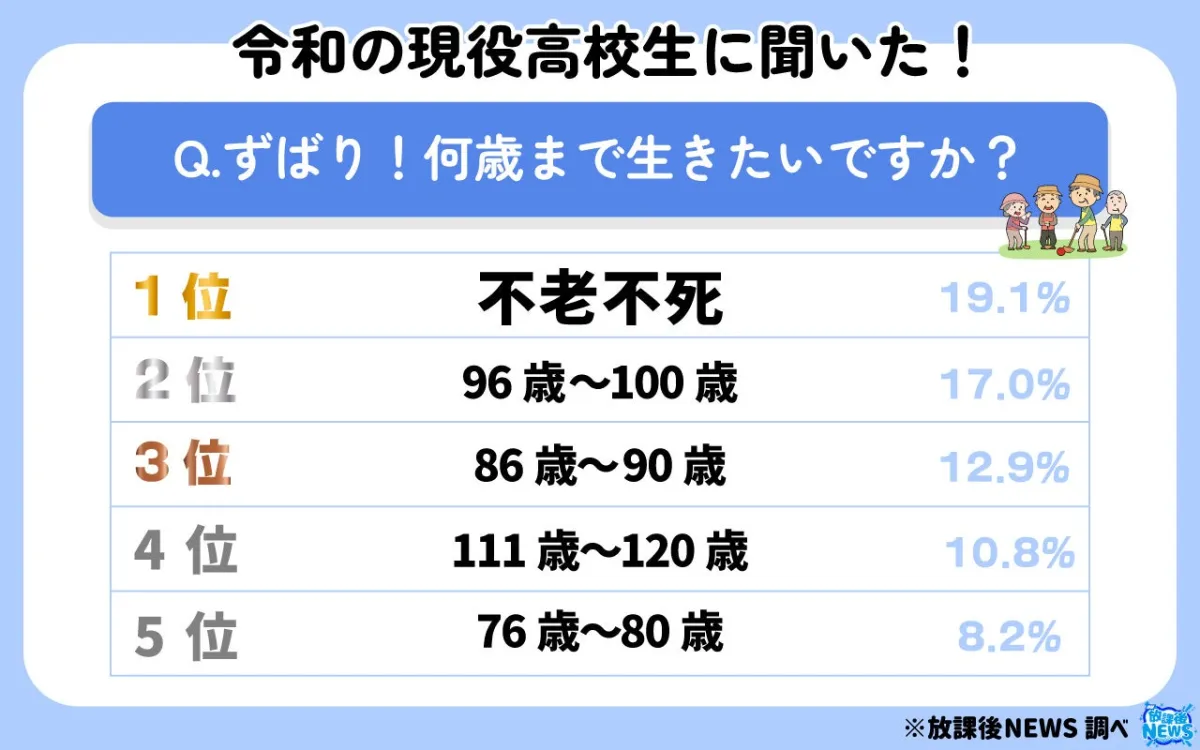 日本では、「人生100年時代」と呼ばれる現代において、長生きへの関心がますます高まっています。特に現役高校生の間で、「不老不死」や「100歳以上生きたい」という意見が多数を占めており、若者たちの未来に対する期待と不安が反映されているようです。