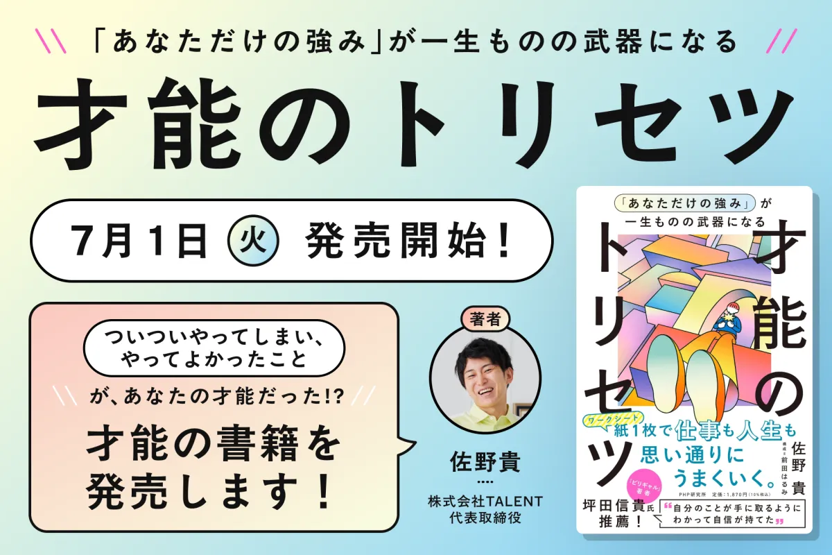 2025年7月1日、株式会社TALENTから新著『あなただけの強み』が発売されます。この書籍は、個々の才能を引き出し、実践的に生かす方法について説いています。著者はIT業界で経験を積み、数多くの人々の才能支援に取り組んできた佐野貴氏です。この本を通じて、あなたの中に眠る才能を引き出し、社会で活躍できる力を養うことを目指します。