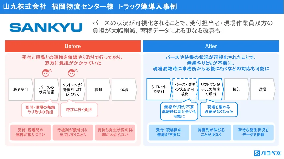 物流業界において、総合効率化法の施行に伴いトラックの荷待ち時間や荷役時間の削減が求められる中、山九株式会社は、隣接する福岡物流センターと第二福岡物流センターに「トラック簿」を導入することを決定しました。その理由として、他のシステムと比較し、受付業務がシンプルに利用できること、導入コストが低かったことが挙げられます。