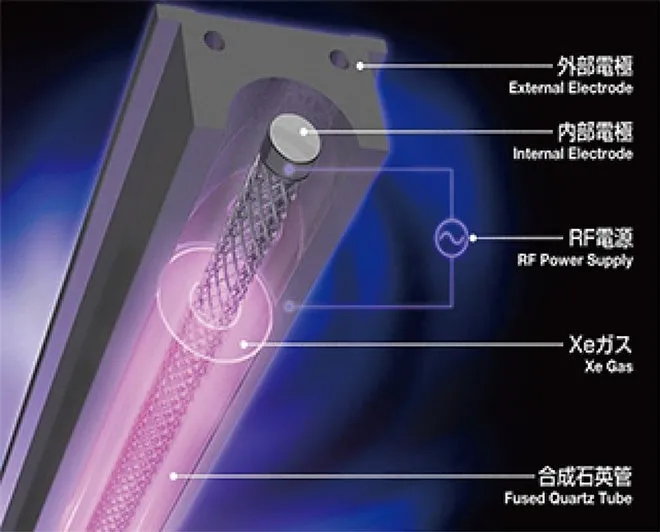 この装置は、水銀フリーの光源を使用し、172nmの高エネルギーを照射することで表面改質を行います。瞬時に点灯・消灯が可能なため、効率的な表面処理が期待できます。表面改質・洗浄・接着力向上など、幅広い用途に対応可能なことが特長です。
