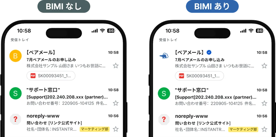 BIMIは、送信元のブランドロゴをメールに表示することができる仕組みです。これにより、受信者はそのメールが正規のものであることを視覚的に認識でき、安心感を持ってメールを開封することができます。BIMIを導入することで、メールの開封率やエンゲージメント率も高まることが期待できるのです。特に、ブランドロゴを表示することで、顧客との信頼関係を強化することに直結します。