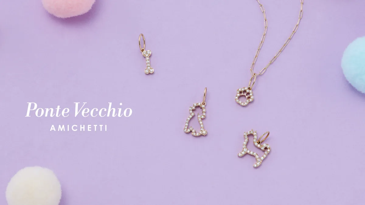 AMICHETTIという名のもとに、愛らしい動物やフルーツのモチーフが集結した遊び心満載のシリーズです。今回は新たに犬モチーフのネックレスチャームとフルーツモチーフの片耳用ピアスがラインナップに加わりました。