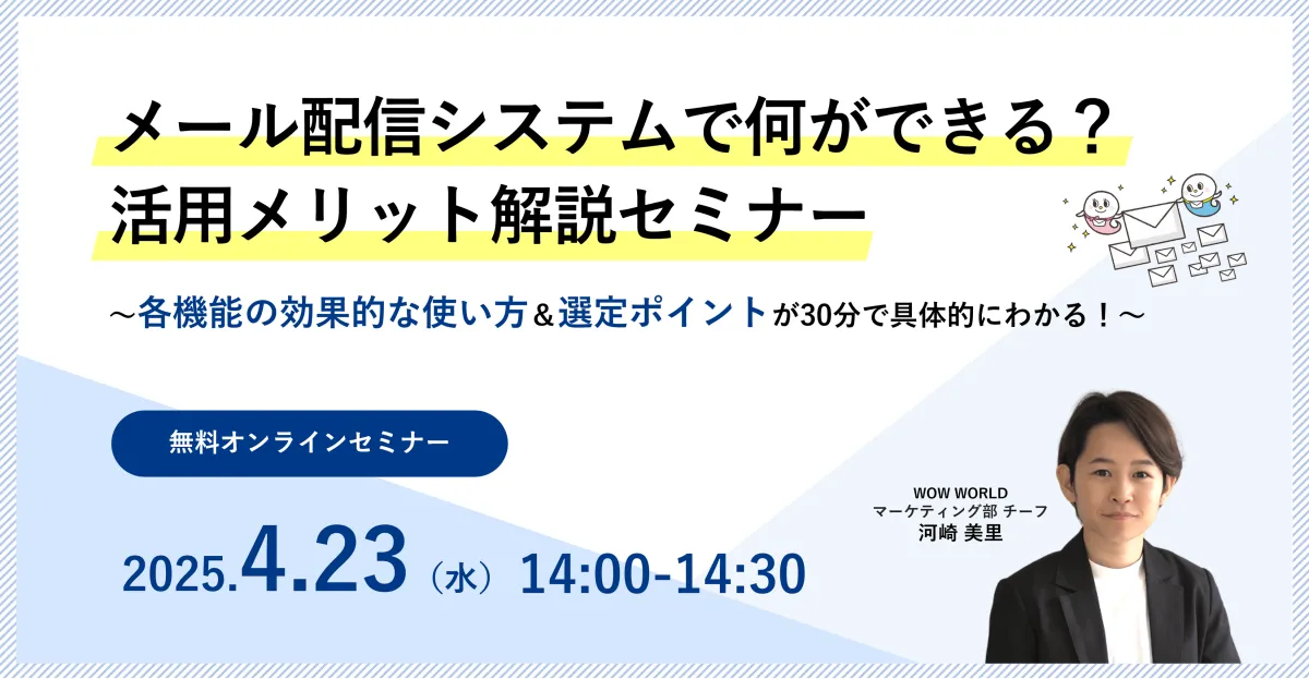 株式会社WOW WORLDは、オンラインでの無料セミナー「メール配信システムで何ができる?活用メリット解説セミナー」を開催します。このセミナーでは、企業や団体のカスタマーエクスペリエンス(CX)を向上させるための具体的なメール配信システムの効果や選定ポイントについて詳細にご紹介します。