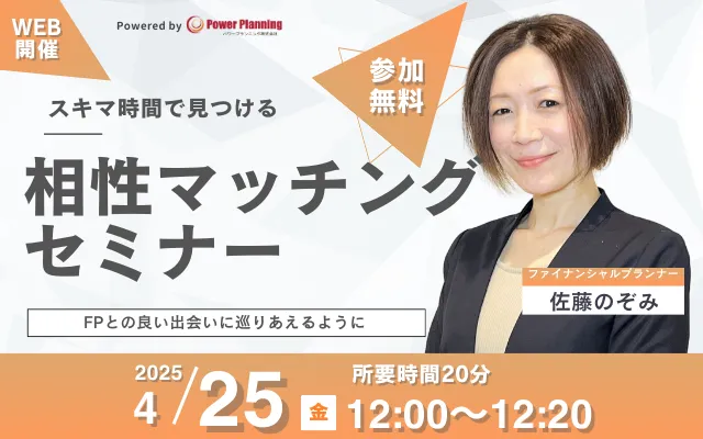 2024年4月25日(金)12時、パワープランニング株式会社が提供する無料マネーセミナー「アットセミナー」が「相性マッチングセミナー」をオンラインで開催します。このセミナーでは、参加者が自分に合ったファイナンシャルプランナー(FP)を見つけることを目的としています。講師には、経験豊富なFPである佐藤のぞみさんが登壇します。