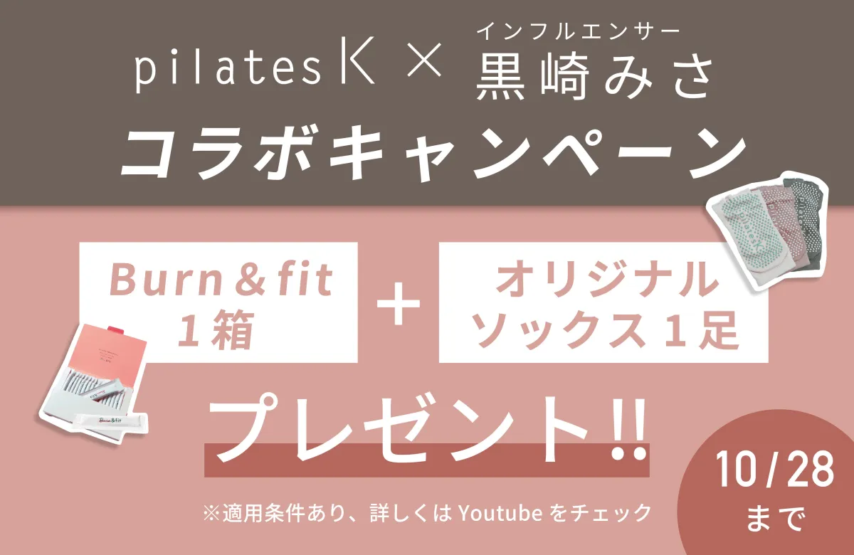 - - 当日入会の際の特典として、pilates Kオリジナルソックスと、&Fitオリジナルの脂肪燃焼サポートドリンク『Burn & fit』が進呈されます。