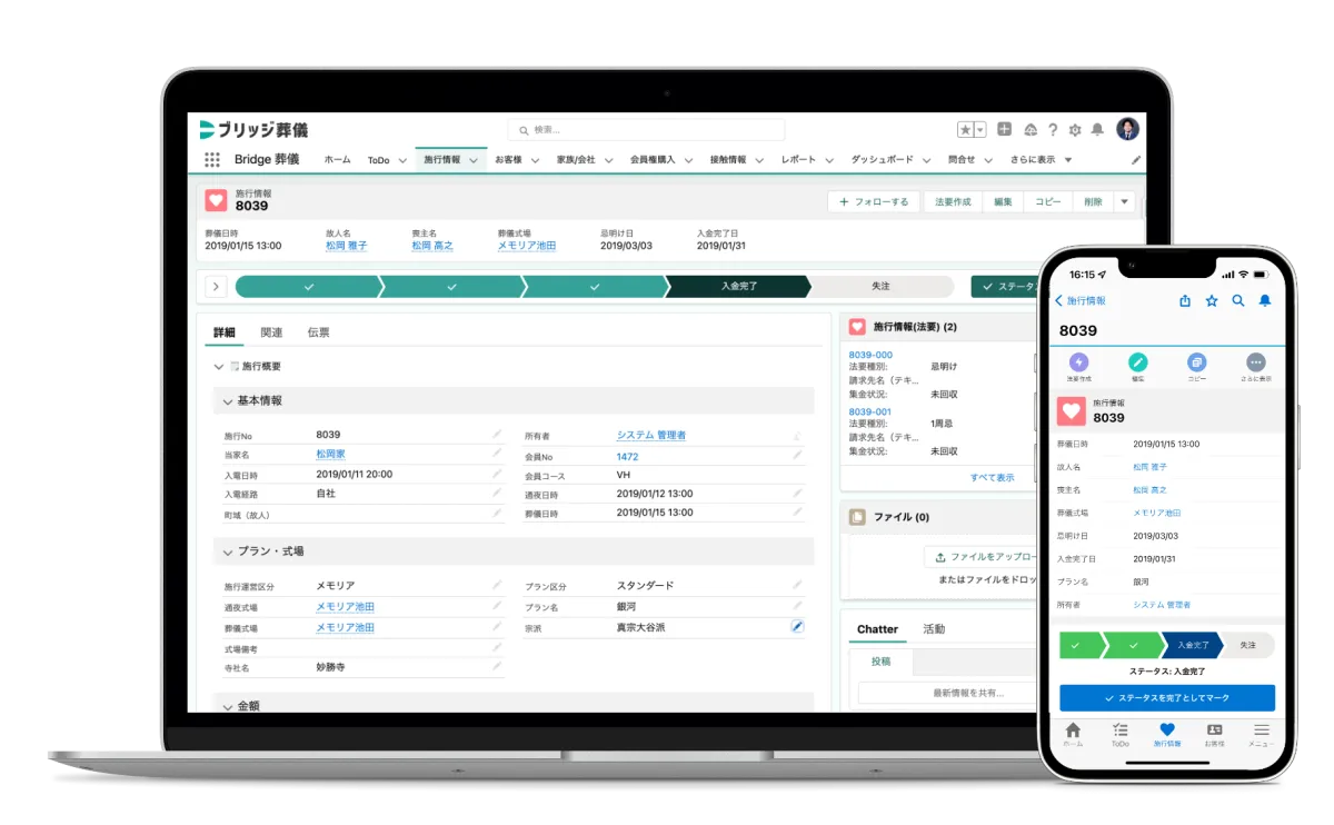 「ブリッジ葬儀」はSalesforceをベースに作成された、葬儀業界特化型の顧客管理システムです。顧客情報、葬儀のスケジュール、売上データなどをまとめて管理することで、葬儀社の業務負担を軽減し、正確なデータ管理を支援しています。最近のアップデートでは、供花供物の専用サイトも提供され、ユーザーは単体での導入が可能になりました。