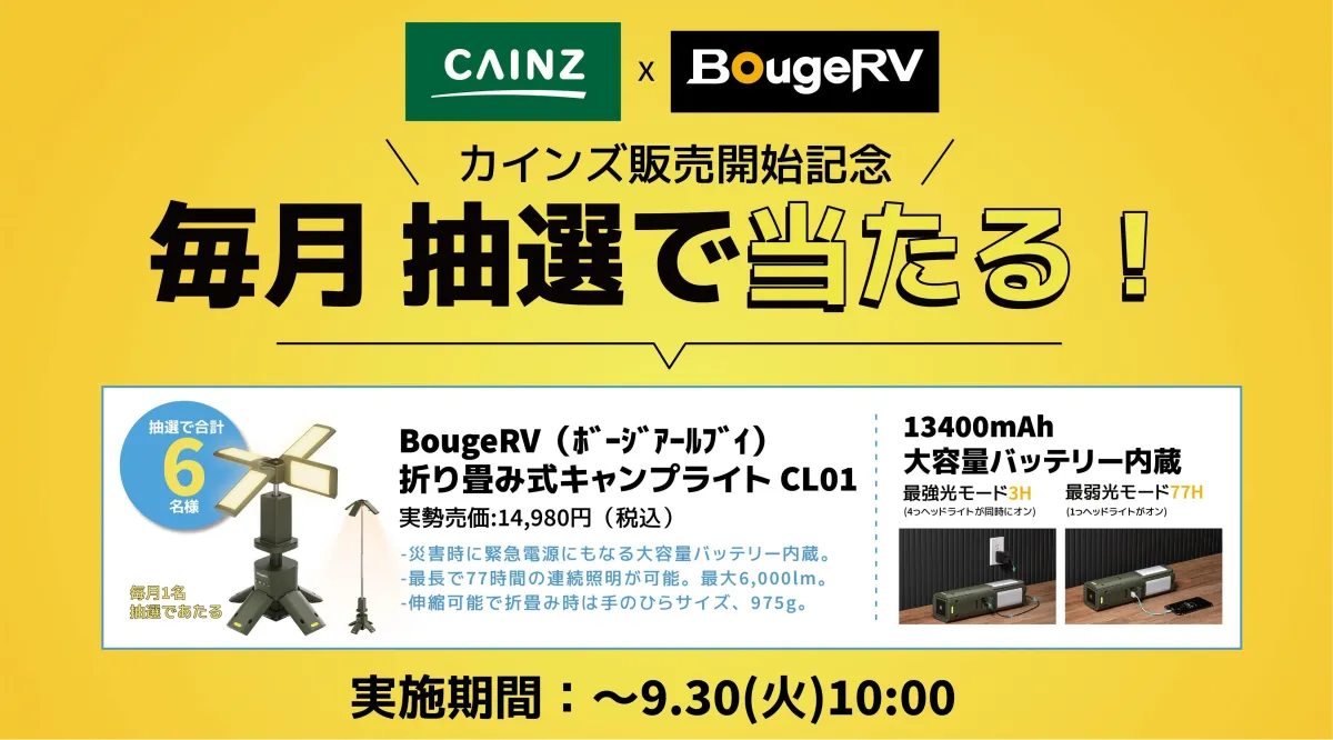 アウトドア愛好者に朗報です!アウトドア生活をサポートする製品を提供するISSYZONE JAPAN株式会社が運営するブランド、BougeRVは、関東圏を中心としたホームセンターCAINZでの販売を開始しました。この機会に、同ブランドは特別な消費者キャンペーンを実施しています。