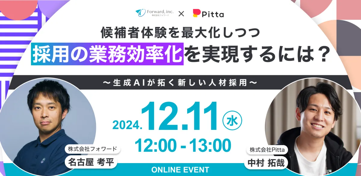 2023年12月11日(水)、株式会社フォワードと株式会社Pittaが共催するウェビナー「候補者体験を最大化しつつ、採用の業務効率化を実現するには?」が開催されます。このイベントは、採用担当者にとって非常に重要な内容であり、特に業務効率化を図りたい人事部門の方々に最適です。