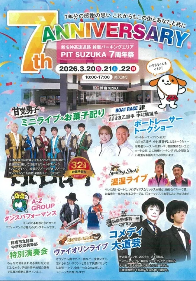 2019年にオープンしたE1A新名神高速道路 鈴鹿パーキングエリア(愛称:PIT SUZUKA)が、2026年3月20日から22日の3日間で7周年を迎え、特別なイベントを開催します。主催は中日本エクシス株式会社三重支店と株式会社ダイナック。イベントは日頃の感謝を込めて、来場者に楽しんでもらう内容盛りだくさんです。