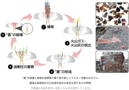 日本の火山における独特な噴火スタイルとして知られるブルカノ式噴火。この噴火は、数時間から数日間の間隔で繰り返される特徴があり、火道の頂部に形成された溶岩の“蓋”が重要な役割を果たしています。この蓋は、火山ガスを閉じ込め、圧力が高まって蓋が壊されることで噴火が引き起こされると考えられています。しかし、この蓋が短期間に再び形成・修復されるメカニズムはこれまで十分に理解されていませんでした。