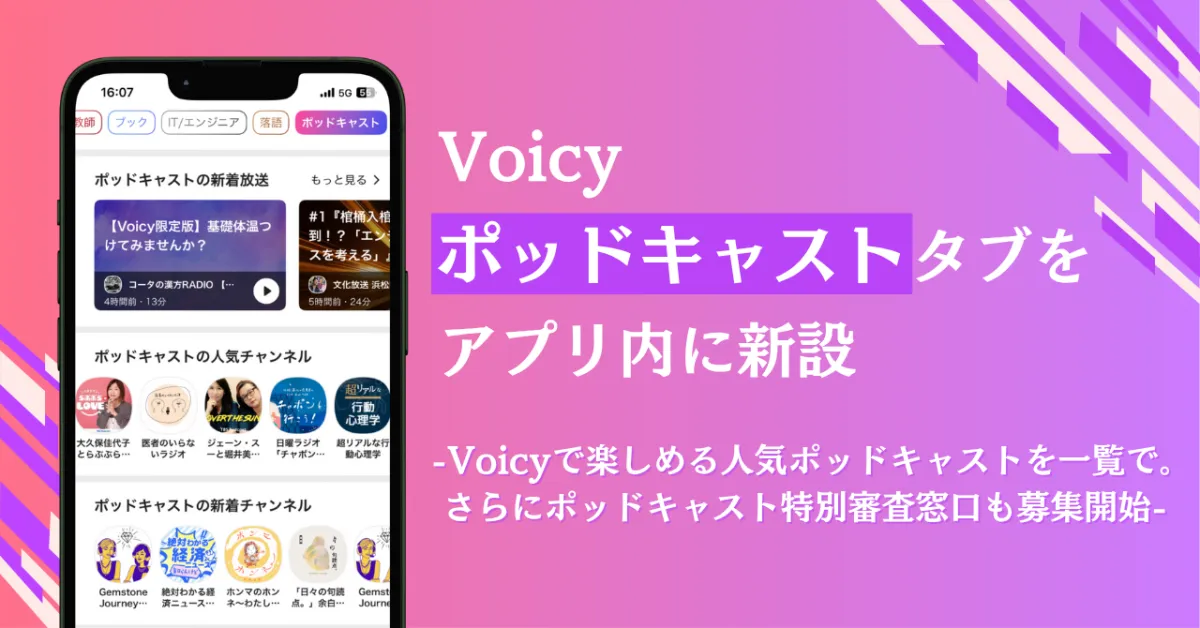 音声コンテンツプラットフォームのVoicyは、リスナーとパーソナリティの双方のニーズを考慮し、新たに「ポッドキャスト」タブをアプリに追加しました。これにより、人気のポッドキャスト番組や新着エピソードが一目でわかるようになり、リスナーはより多様な音声体験を楽しめるようになります。