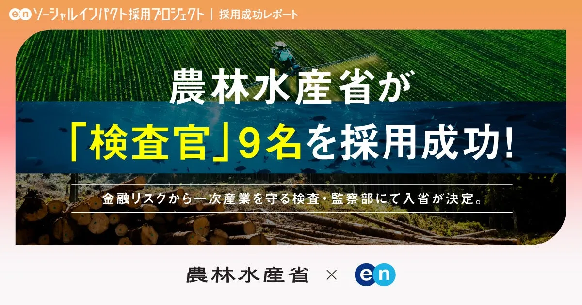 農林水産省は、エン株式会社と協力して「ソーシャルインパクト採用プロジェクト」を実施し、411件の応募の中から9名の検査官を採用することが決まりました。この取り組みは、公共性を重視した人材の採用を目指すもので、今後の農林水産業の発展に寄与することが期待されています。