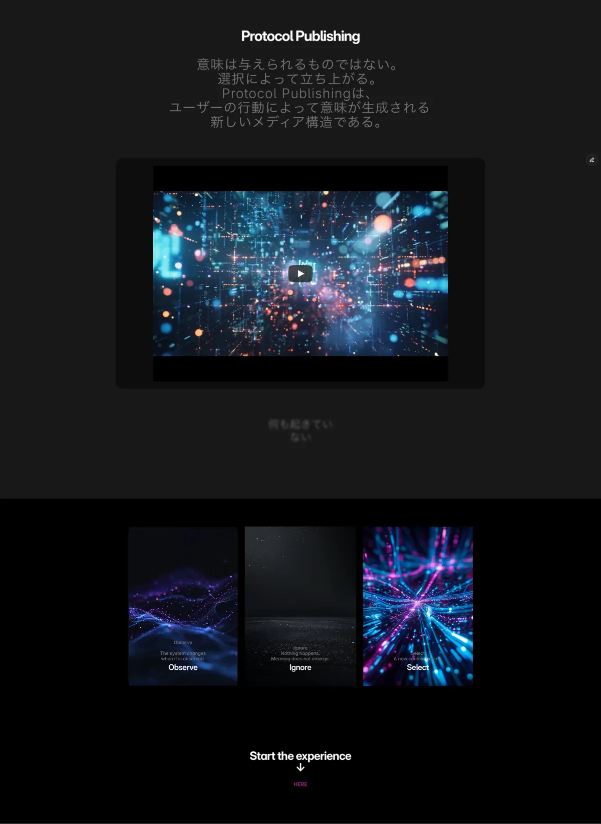 SHIRO & Co.は「Protocol Publishing」以降の発展として、生成された表現物を「場(Field)」として扱う新構想も提案しています。現在、SNS上に断片的に存在している生成AIによるコンテンツを、これまでのプロトコルによって接続された状態として再配置します。このプロセスにより、ユーザーが行う観測、無視、選択によって意味が変わる新たな空間を構築しようとしています。