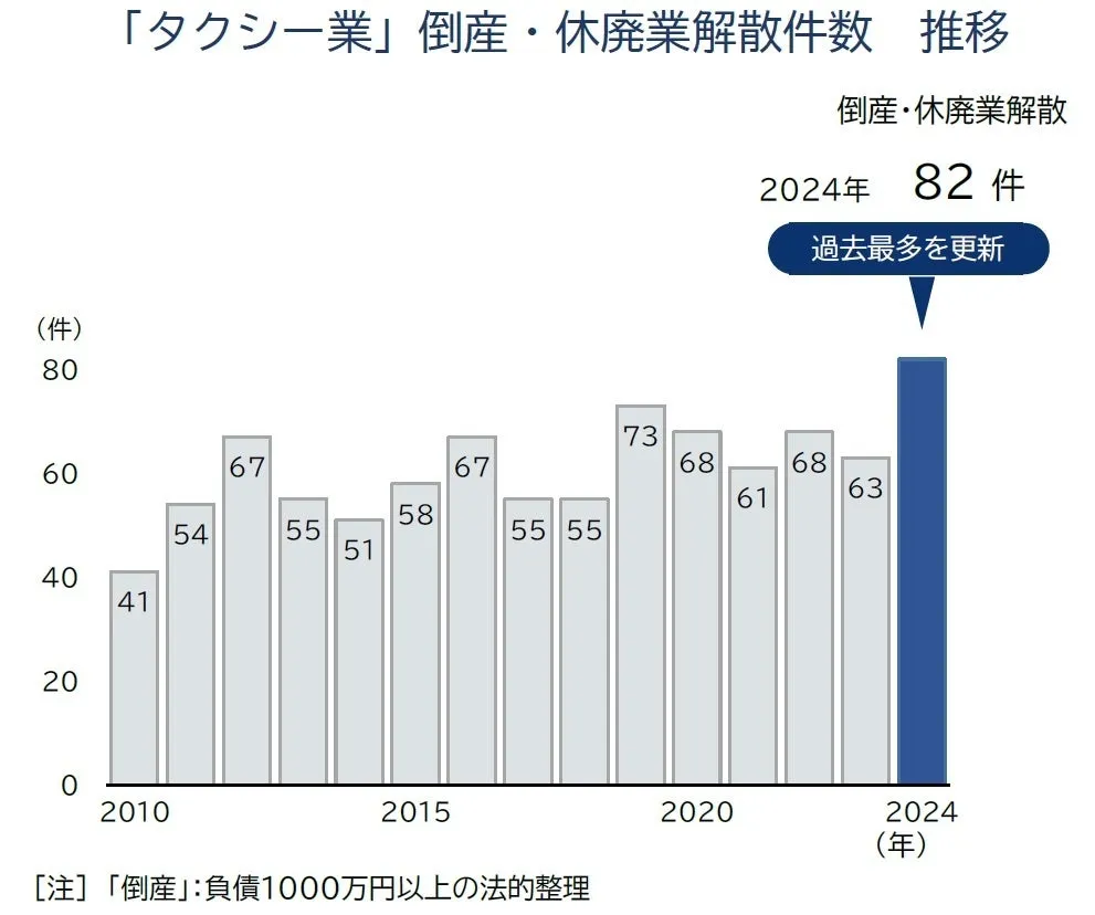 近年、全国的にタクシーをつかまえることが困難な状況が続いています。その背景には、深刻なドライバー不足があります。株式会社帝国データバンクの調査によると、2024年にタクシー業界で発生した倒産・休廃業の件数は82件に達しました。これは、前年比で30.2%の増加を示し、過去最多の事例となりました。特に、負債1000万円以上の法的整理による倒産が急増しており、その約4割はドライバー不足が原因です。