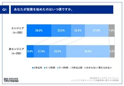 エンジニアが「1年以内」に投資を始めた割合は28.0%で、これは非エンジニアの20ポイント増。エンジニアの新規参入が進む中、非エンジニアは長期投資に重点を置いていることが見受けられます。