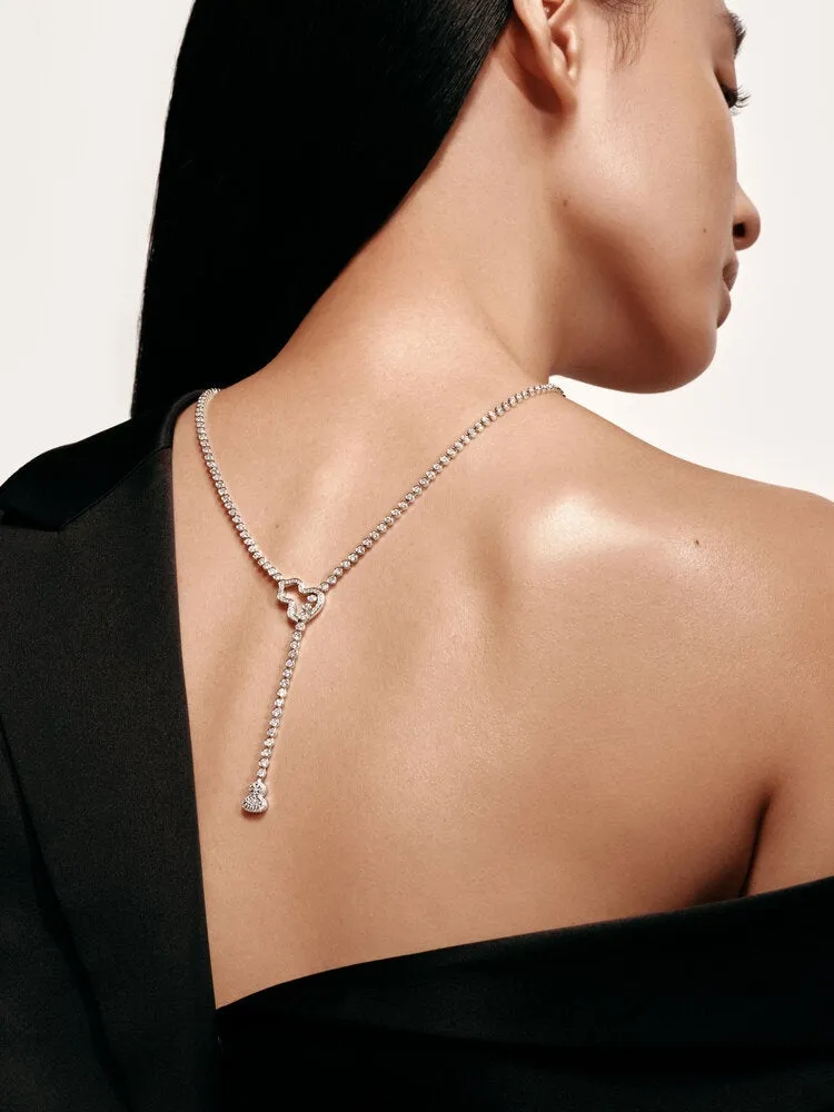 新しく採用された「Y字型」シルエットは、きらめくダイヤモンドの輪郭やパヴェダイヤモンドが施されており、現代的な『Wulu』モチーフを最大限に引き出しています。職人の手によって丁寧に仕上げられたこのネックレスは、タイムレスで高貴な存在感を持ち、多くのスタイルに合わせやすいようデザインされています。