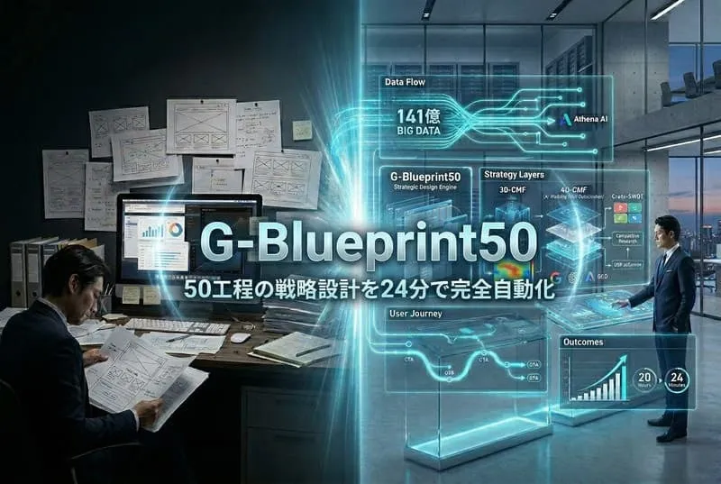 G-Blueprint50は、WEBサイト設計の全50工程を自動化し、従来の制作期間を大幅に短縮します。具体的には、従来の20時間以上かかるプロセスが、わずか24分で完了します。この革新を支えるのは、141億パターンに及ぶ顧客行動のビッグデータと、ガーディアン社の独自AI「Athena」です。これにより、業界分析や競合調査、SEO戦略など、幅広いマーケティング施策を一元化し、高度化しています。