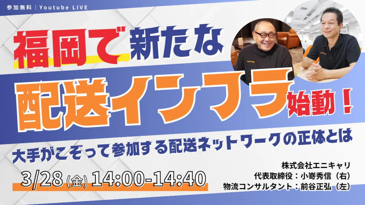 2025年3月28日(金)14時、株式会社エニキャリが生中継で福岡で始まる新たな配送インフラについて解説します。このたびのライブ配信のテーマは「福岡で新たな配送インフラ始動!~大手がこぞって参加する配送インフラの正体とは~」。