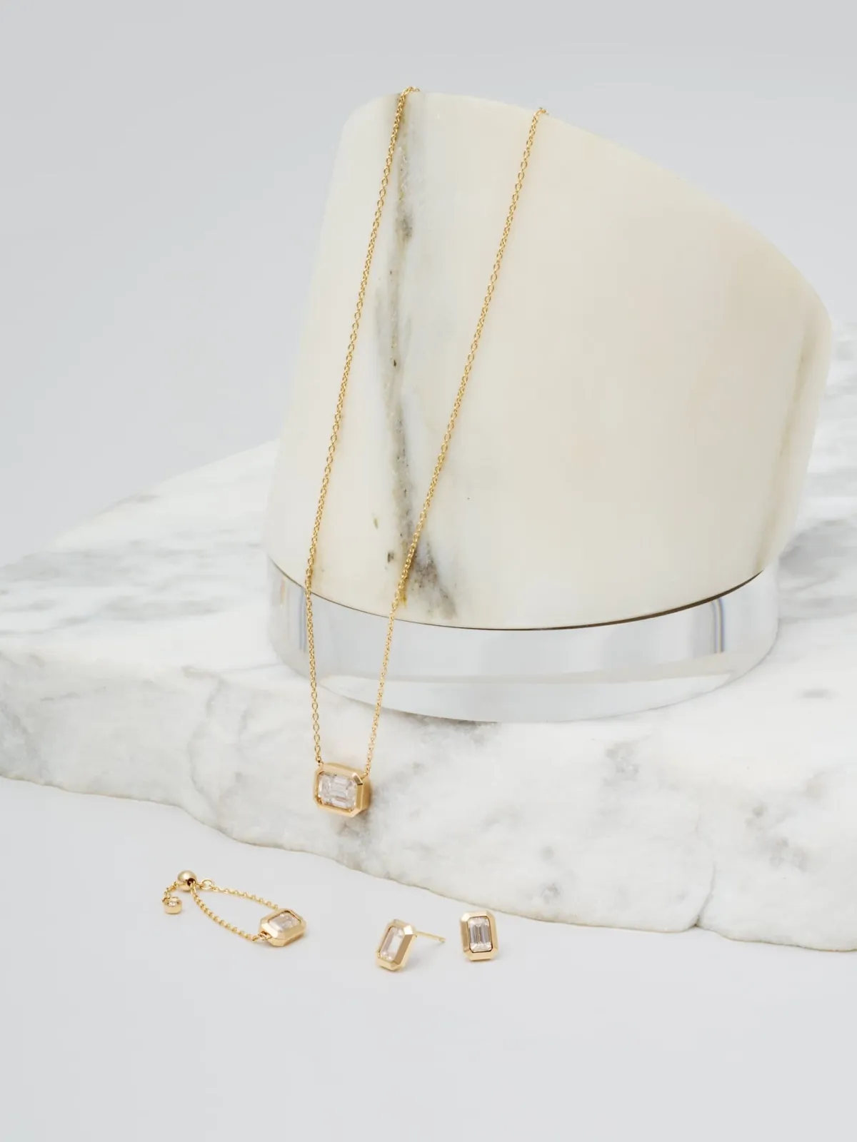 PLUS VENDOMEが、再び注目のアイテムを発表しました。新作は、合成モアッサナイトを用いたラボグロウンストーンのコレクションです。特に、エメラルドカットで仕上げられた大ぶりな石を用いたネックレスや、チェーンリング、ピアスなど、スタイリッシュなデザインが光ります。