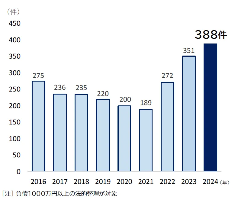 2024年は、コンプライアンス違反が原因で倒産した企業が388件に達し、過去最多を記録しました。これは2023年に比べて37件多く、前年比で見ると約10.5%の増加です。この急増には、サービス業を中心としたさまざまな要因が影響を及ぼしています。