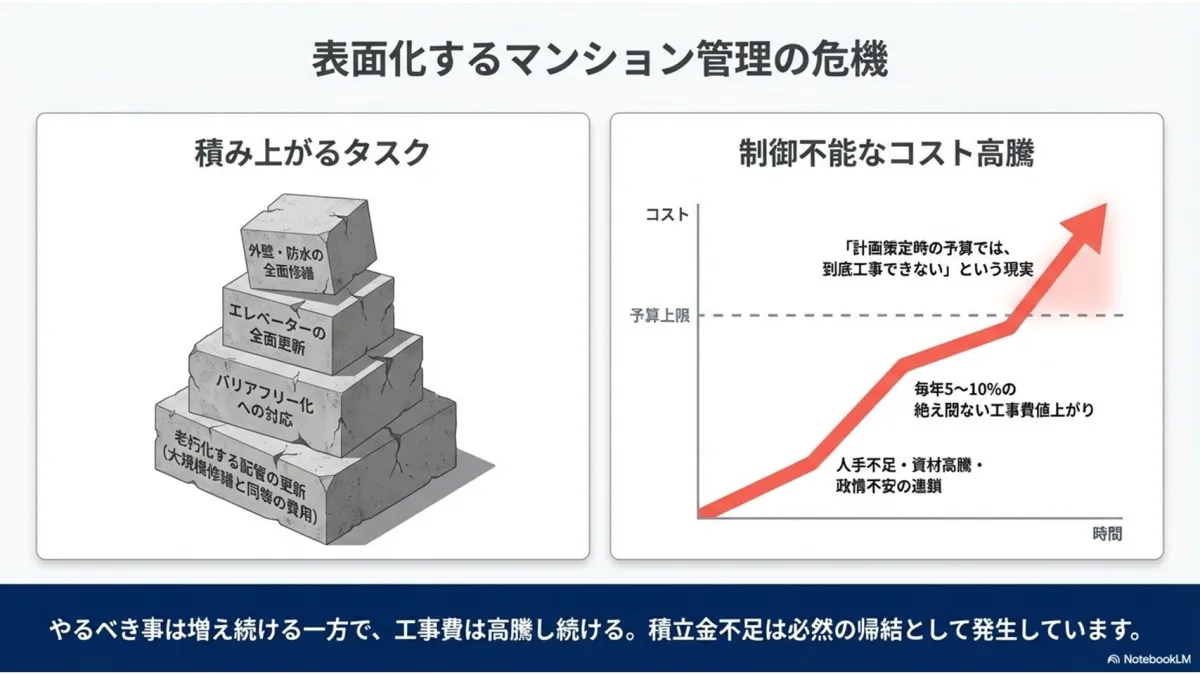 修繕積立金が不足する原因は、主に長期修繕計画自体の設計にあります。具体的には、以下のような問題が指摘されています:
