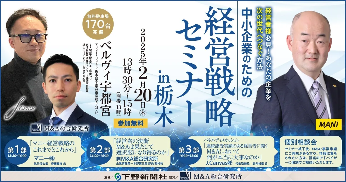 2025年2月20日(木)、栃木県宇都宮市で中小企業の事業承継および成長戦略に関するセミナーが開催されます。このセミナーは下野新聞社の主催で、地域の中小企業経営者や関心のある方々に向けた貴重な情報提供の場となります。
