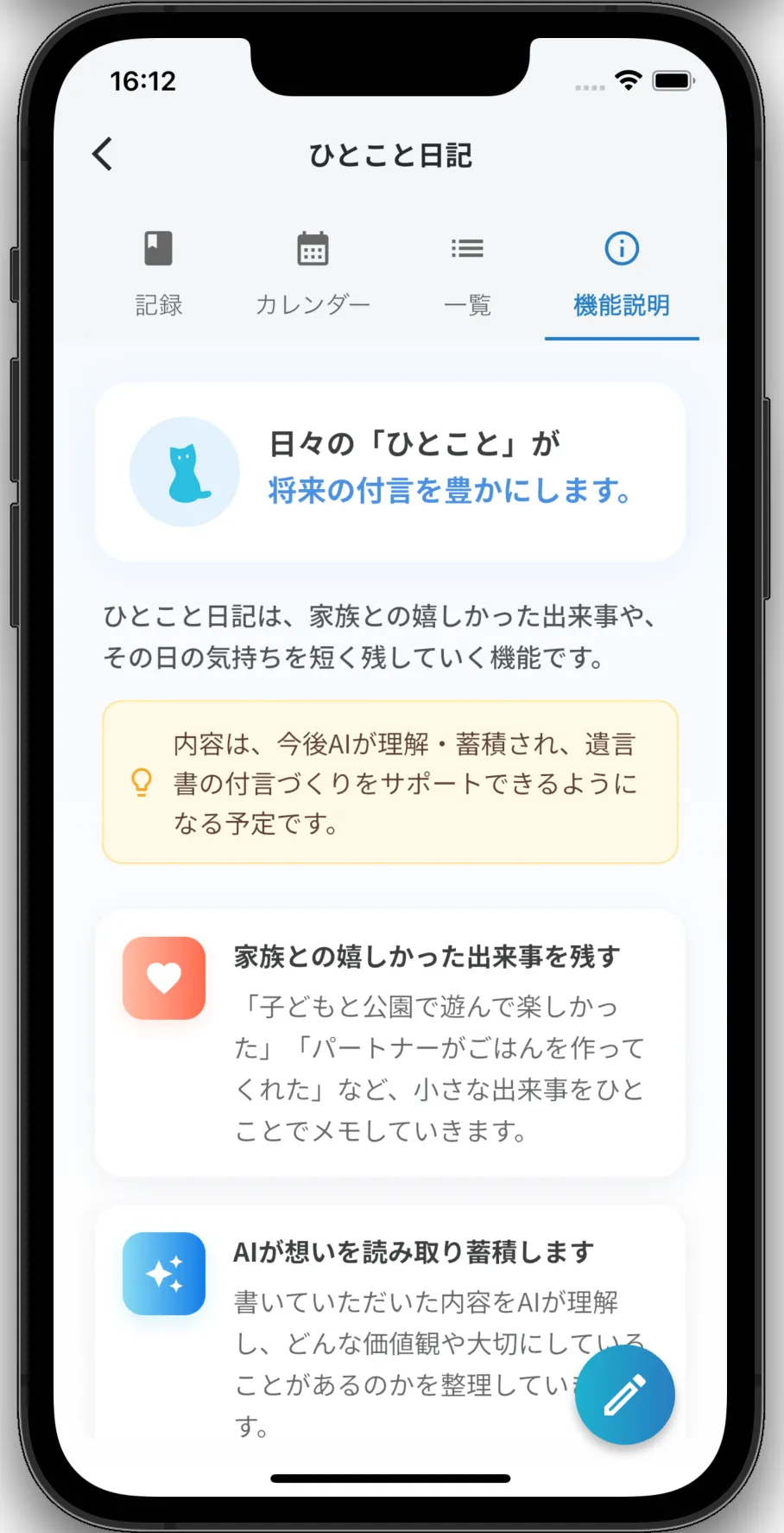 この機能は、日々の感情や出来事、家族への思いを自由に書き留めることができる日記機能です。これにより、自身の考えを整理し、将来の遺言書作成時に役立つ情報を蓄積することができます。遺言を「いきなり書くのはハードルが高い」と感じる方々にとって、前段階として有効な機能です。記入した日記は将来的にAIが遺言書草案のために参考にできるようになります。