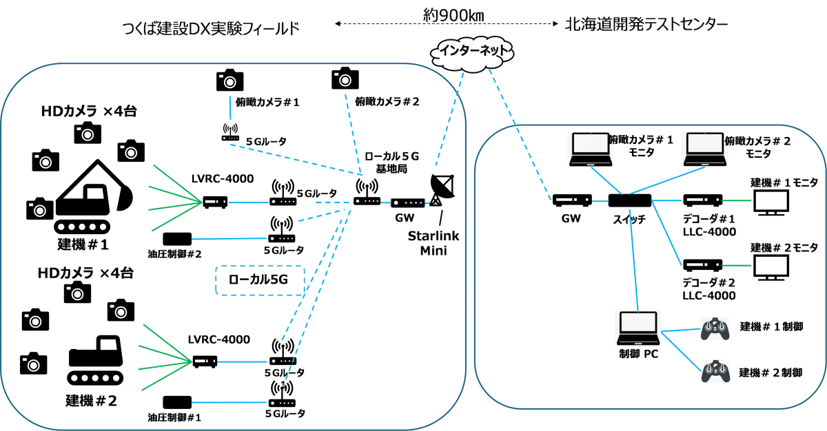 つくば建設DX実験フィールドでは、2つの建機それぞれに4台のハイビジョンカメラが搭載され、「LVRC-4000」で映像を圧縮。さらに俯瞰カメラを加えた合計10台の映像を「Starlink Mini」で約900㎞先のテストセンターに送信しました。オペレーターは遠隔地からも建機を効率的に操縦できたことを確認し、今後の商用化に向けた期待が寄せられています。