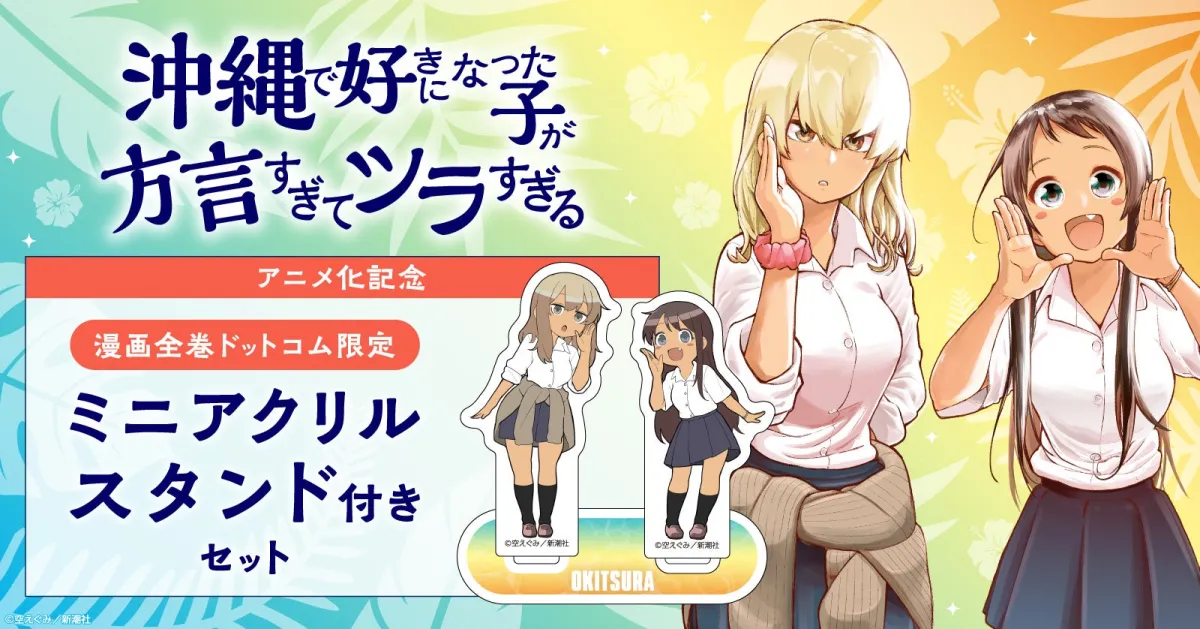 2025年1月のアニメ放送が決定した話題の作品『沖縄で好きになった子が方言すぎてツラすぎる』。こちらのアニメ化を記念して、漫画全巻ドットコムでは特別なセットの予約受付が始まりました。お求めの全巻セットを購入すると、空えぐみ先生が描き下ろしたかわいいミニキャラのアクリルスタンドが入手できます。この特別特典は漫画全巻ドットコム限定のオリジナル商品ですので、ファンにはたまらないチャンスです!