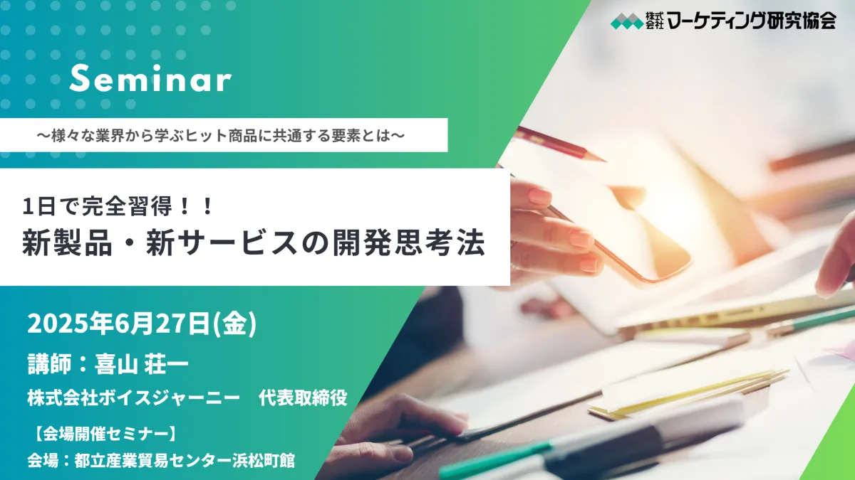 2025年6月27日、株式会社マーケティング研究協会主催のセミナーが開催されます。新製品や新サービスの開発についての思考法を学び、“売れる理由”を言語化し、再現性のある企画スキルを身につける1日です。