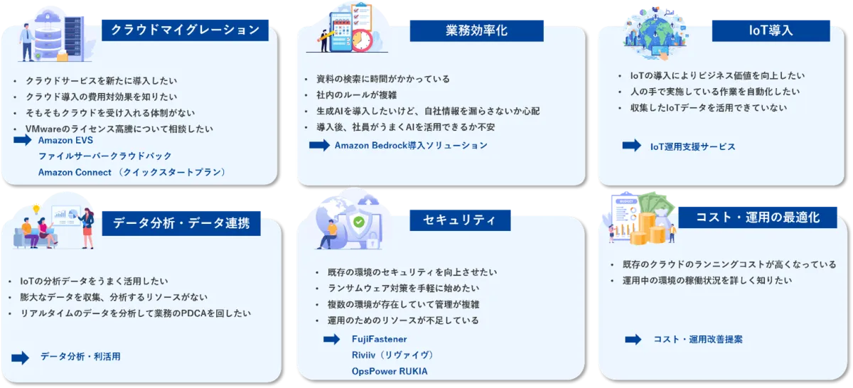 富士ソフトは、AWSに関する幅広いサービスを提供しています。クラウド基盤としての設計・導入から運用、最新サービスの活用支援までも対応しており、あらゆるシステムに対してAWSが持つ最新技術を駆使して、お客様のビジネスに価値を加えるサービスを展開しています。企業は、この新たなAWSソリューションを活用することで、デジタルシフトを加速し、競争力を強化することができるでしょう。