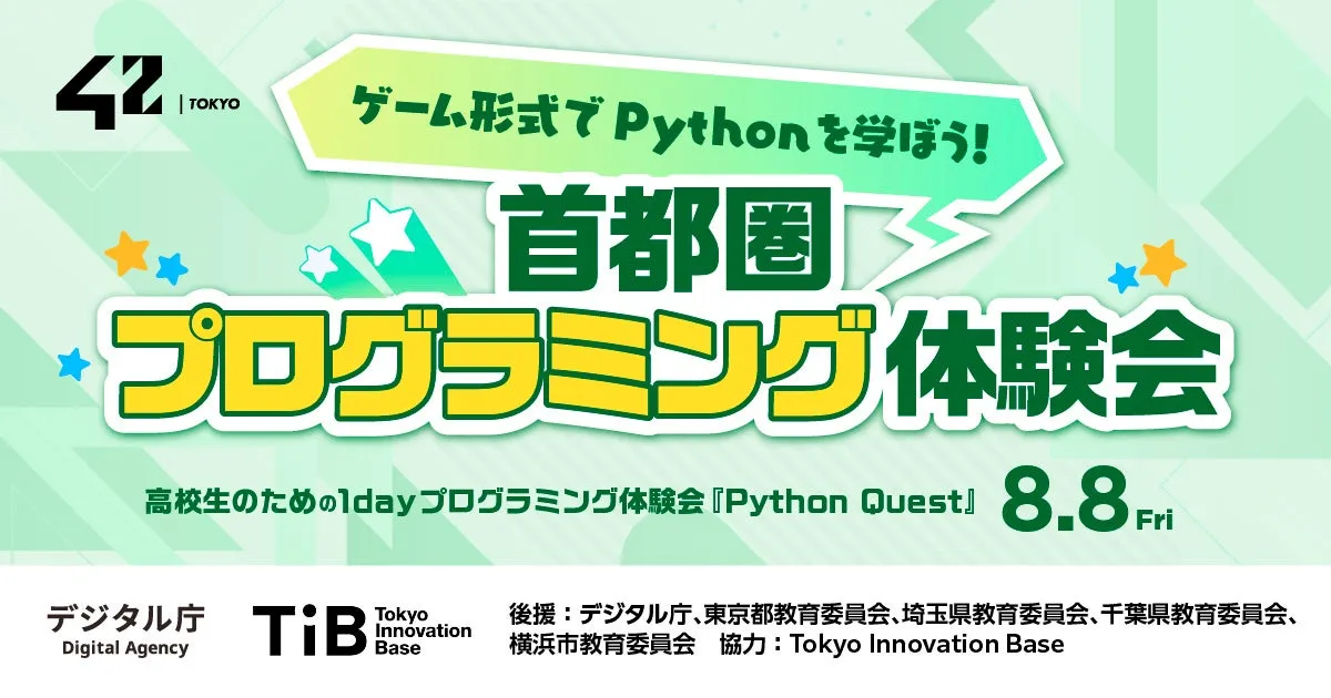 2025年8月8日(金)、東京都千代田区にあるTokyo Innovation Baseで、首都圏の高校生の皆さんを対象にした無料の1dayプログラミング体験会『Python Quest』が開催されます。このイベントは、一般社団法人42 Tokyoが主催し、首都圏の教育委員会の後援を受けて行われます。参加の申し込みは2025年6月19日から開始し、定員は100名となっています。