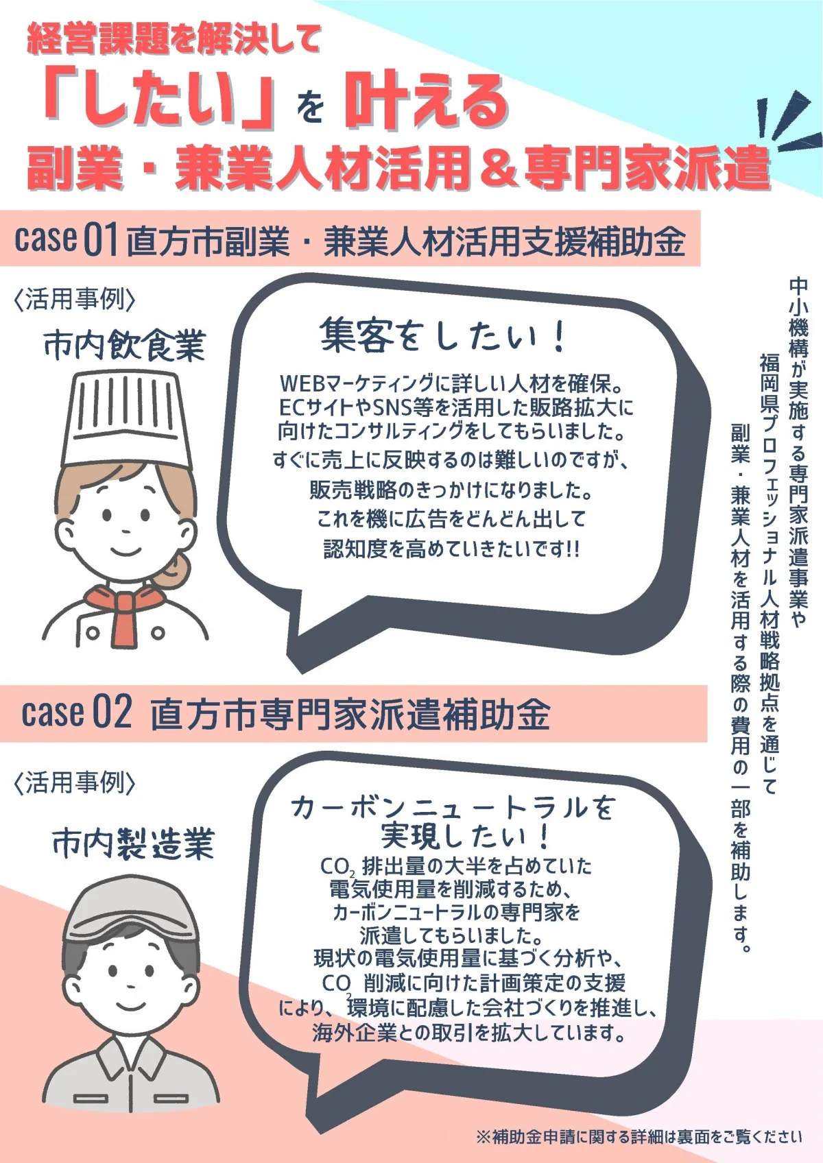 福岡県プロフェッショナル人材戦略拠点を通じてマッチングした副業や兼業の人材に対して、事業者の負担する費用の半額(上限20万円)を補助します。ただし、福岡県プロフェッショナル人材戦略拠点を利用しない場合は、補助金の対象外となります。