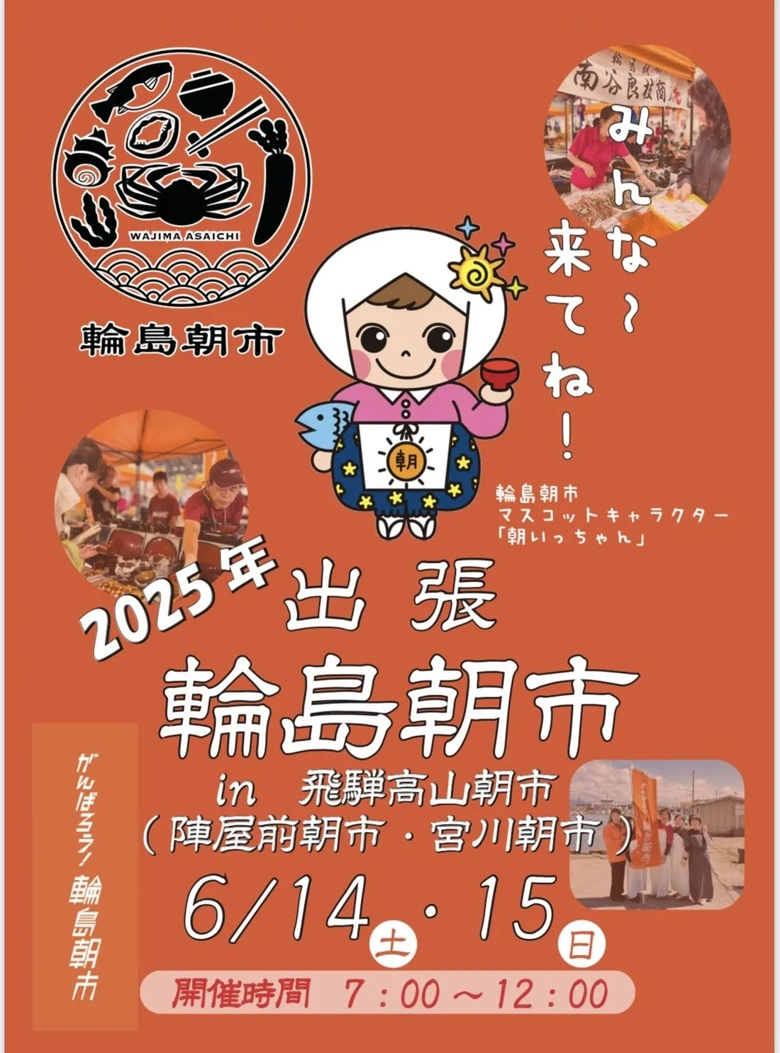 日程は令和7年6月14日(土)から15日(日)までの2日間。両日とも朝7時から正午まで、陣屋前朝市と宮川朝市にて開催されます。参加店舗には、輪島の特産品や工芸品を販売する出店者が集結し、来場者に直接その魅力を伝えます。