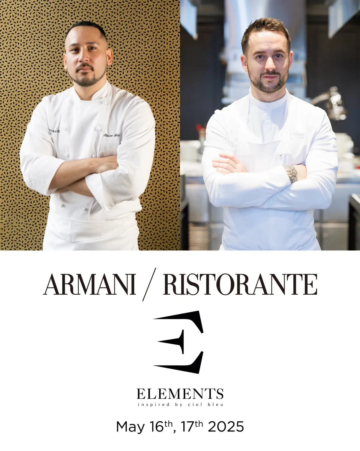 「ARMANI / RISTORANTE(アルマーニ・リストランテ)」が、2025年5月16日(金)と17日(土)の2日間、特別な4 Hands Dinnerを開催します。このイベントでは、タイ・バンコクにあるミシュラン一つ星レストラン「Elements, inspired by Ciel Bleu」(エレメンツ インスパイアード・バイ・シエル・ブルー)のジェラール・ヴィラレ・オルカホシェフを迎え、両シェフの卓越した料理技術を披露します。
