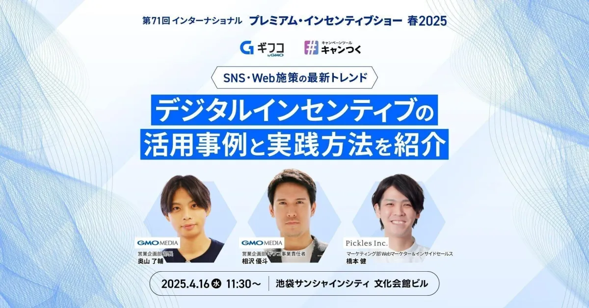 GMOメディア株式会社と株式会社ピクルスは、2025年4月16日(水)から18日(金)まで、池袋サンシャインシティ文化会館にて開催される『第71回インターナショナル プレミアムインセンティブショー 春 2025』に初出展します。このイベントの初日には、特設ステージにてデジタルインセンティブの活用事例を中心にした特別講演会を行います。