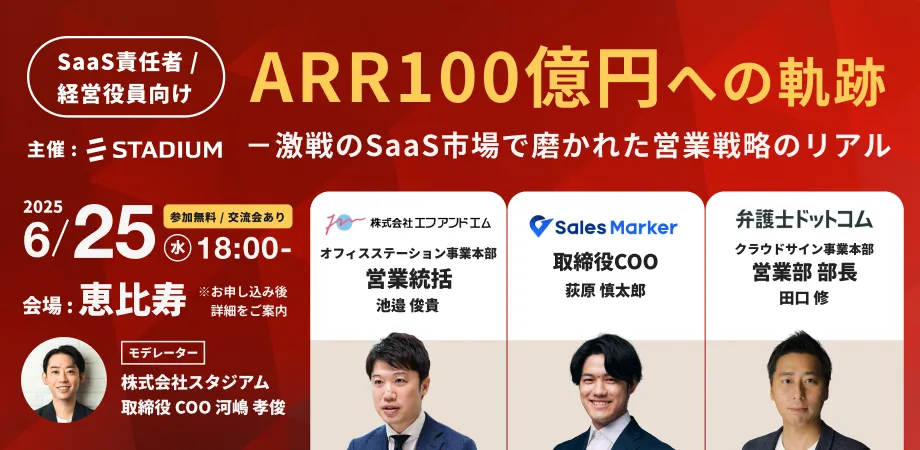 2025年6月25日(水曜日)に、株式会社スタジアムが主催するイベント「ARR100億円への軌跡」が開催されます。このイベントは、ARR(Annual Recurring Revenue)10億円から50億円のフェーズにあるSaaS企業の既存及び新規の営業責任者やエグゼクティブを中心に、競争が激化する市場での営業戦略をテーマにしています。