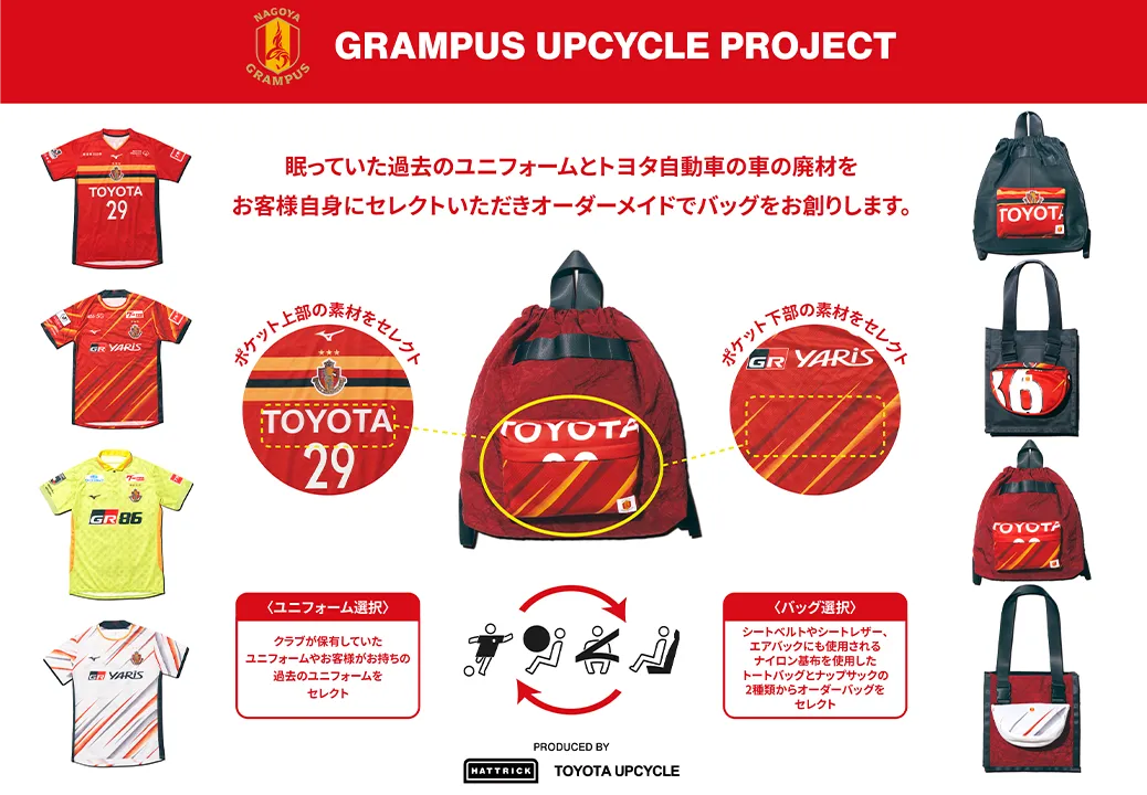 この取り組みは、環境問題に対する意識が高まる中、持続可能な社会の実現に向けたものであり、リユースやリサイクルの推進を目的としています。特に、名古屋グランパスのユニフォームとトヨタの製造過程で生じる廃材(ナイロン基布やシートベルト、シートレザーなど)を活用することで、お客様自身が選んだ素材でバッグを作成できるのが大きなポイントです。