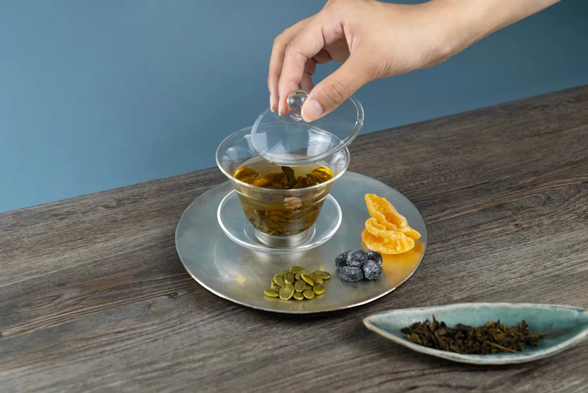 この蓋碗は、茶葉の動きがダイレクトに楽しめるように設計されています。お湯を注ぐと、茶葉がふわりと開き、まるで舞い踊るかのようです。目で楽しむだけでなく、豊かな香りも同時に感じることができ、視覚と香り、味わいの三位一体を実現しています。