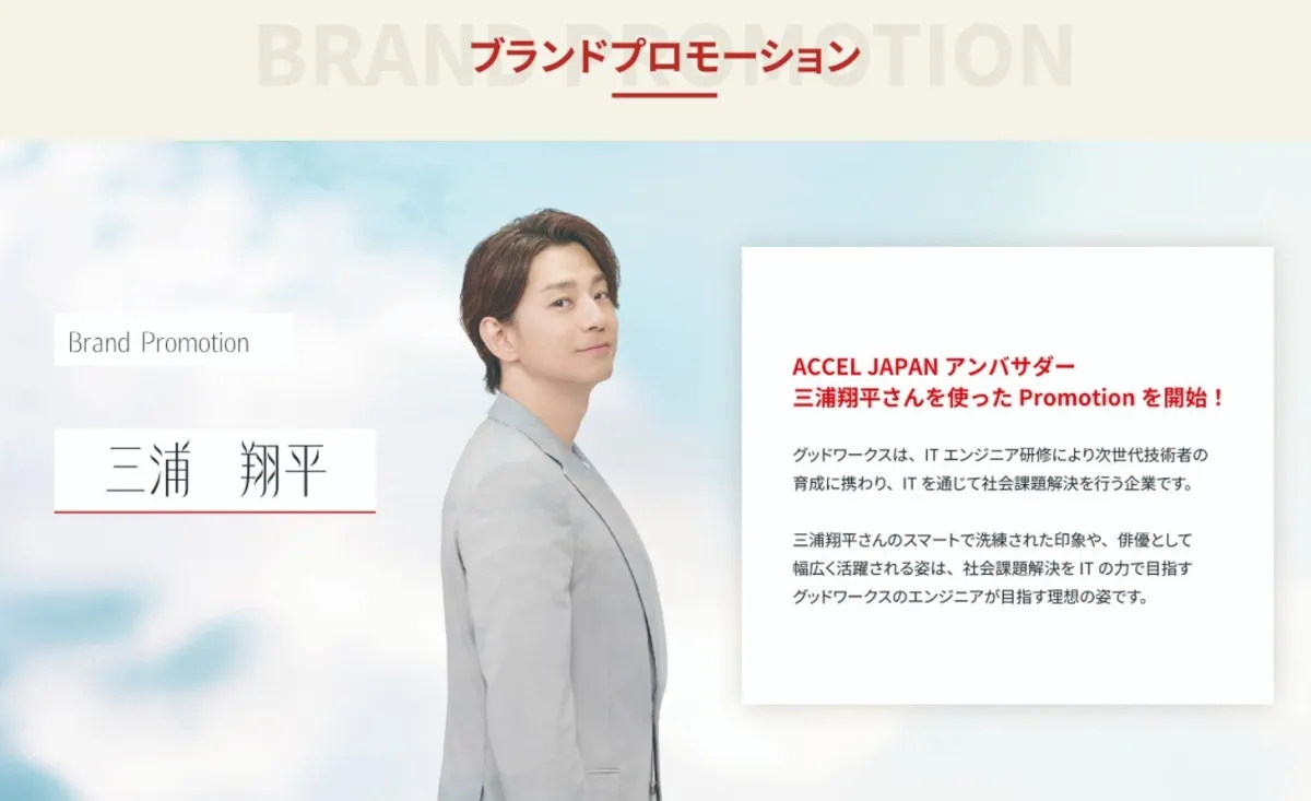 この背景において、グッドワークスは三浦翔平さんをアンバサダーに起用し、ACCEL JAPANへの参画を決定しました。三浦さんの誠実で前向きな姿勢は、グッドワークスのブランドイメージと非常に相性が良いと考えています。