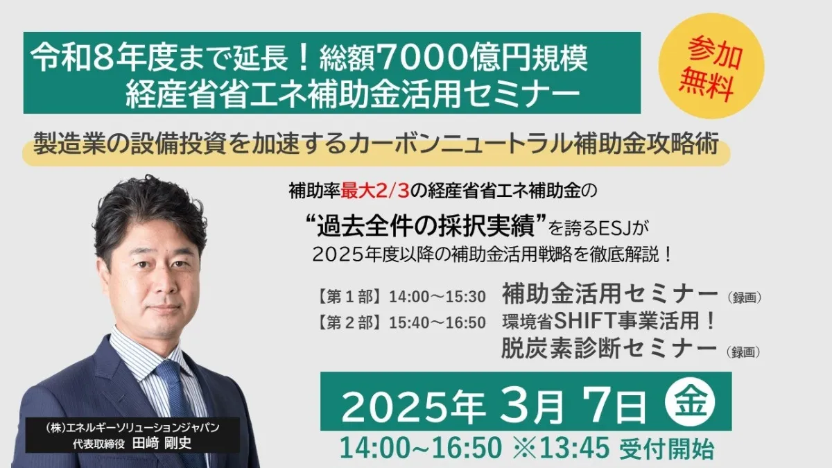 2025年3月7日、エネルギーソリューションジャパン(ESJ)は、製造業向けに無料オンラインセミナー「令和8年度まで延長!総額7000億円規模補助金活用セミナー」を開催します。このセミナーでは、経済産業省が設けた補助金制度を最大限に活用するためのノウハウを提供します。特に、カーボンニュートラルに向けた設備投資をこれから考えている企業や、既に取り組みを進めている企業にとって、有意義な内容となっています。