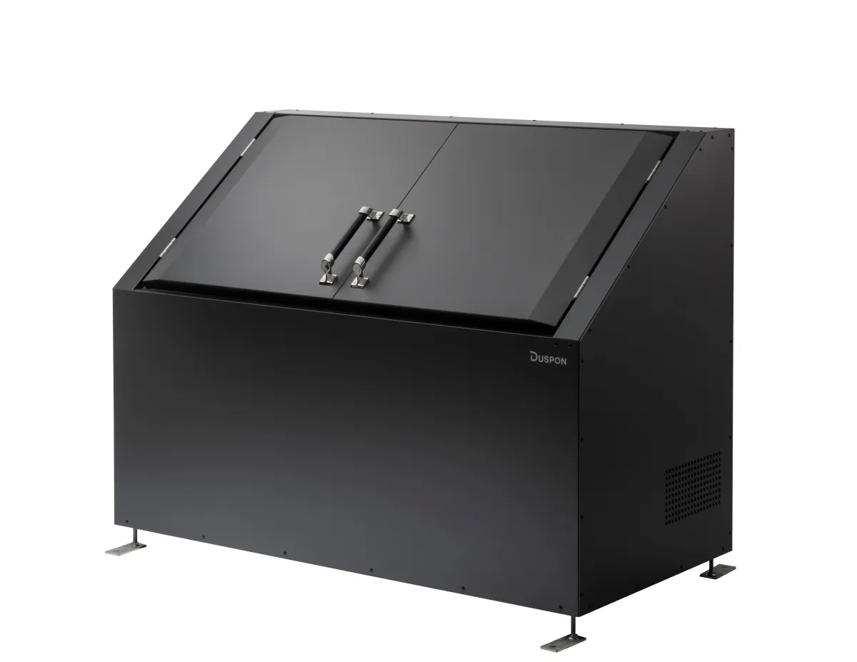 「ダスポン」とは、当社独自に開発したごみ集積庫のこと。それは、自社開発により実現した機能性、安全性、デザイン性を兼ね備えた商品です。このシリーズは、容量約580Lからのサイズ展開があり、ステンレス製と黒ZAM®製とのバリエーションがあります。特に、黒ZAM®製のモデルは、周囲の環境にマッチしやすく、多くの利用者から支持を受けているのです。