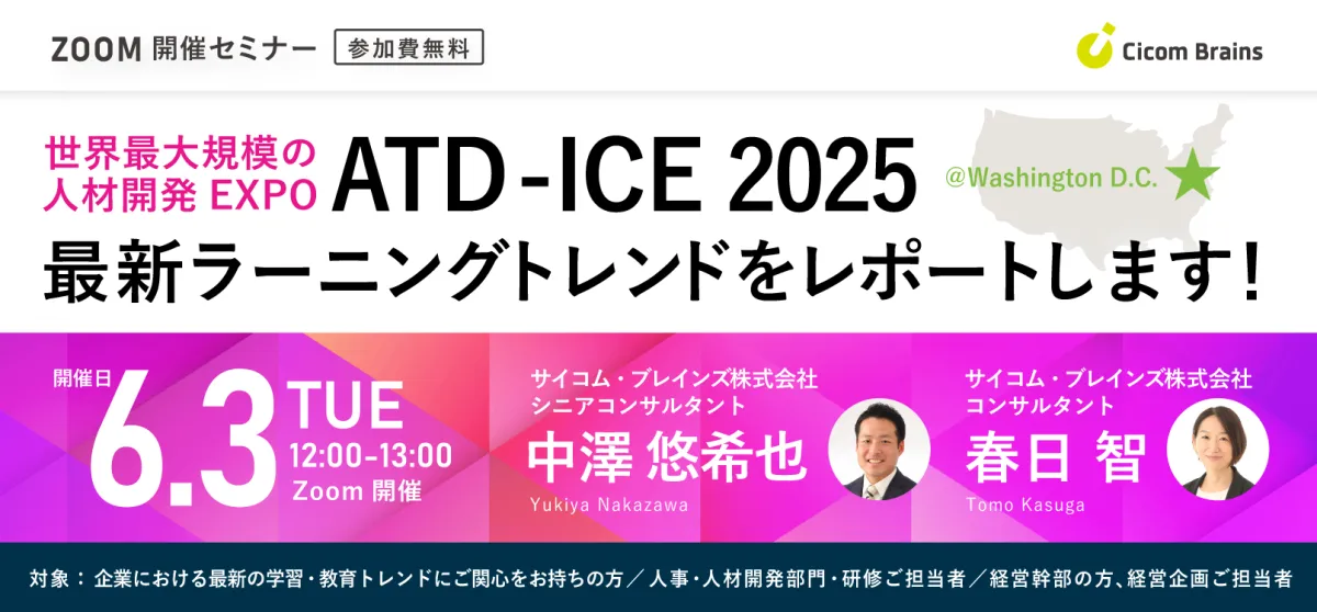 本セミナーでは、ATD-ICE 2025に参加予定のコンサルタント2名が、自身の体験をもとに最新のラーニングトレンドや業界の動きについてレポートします。セミナーでは、注目すべき講演内容やキーワード、おすすめのソリューションについても触れ、人材開発における今後のトレンドを読み解きます。