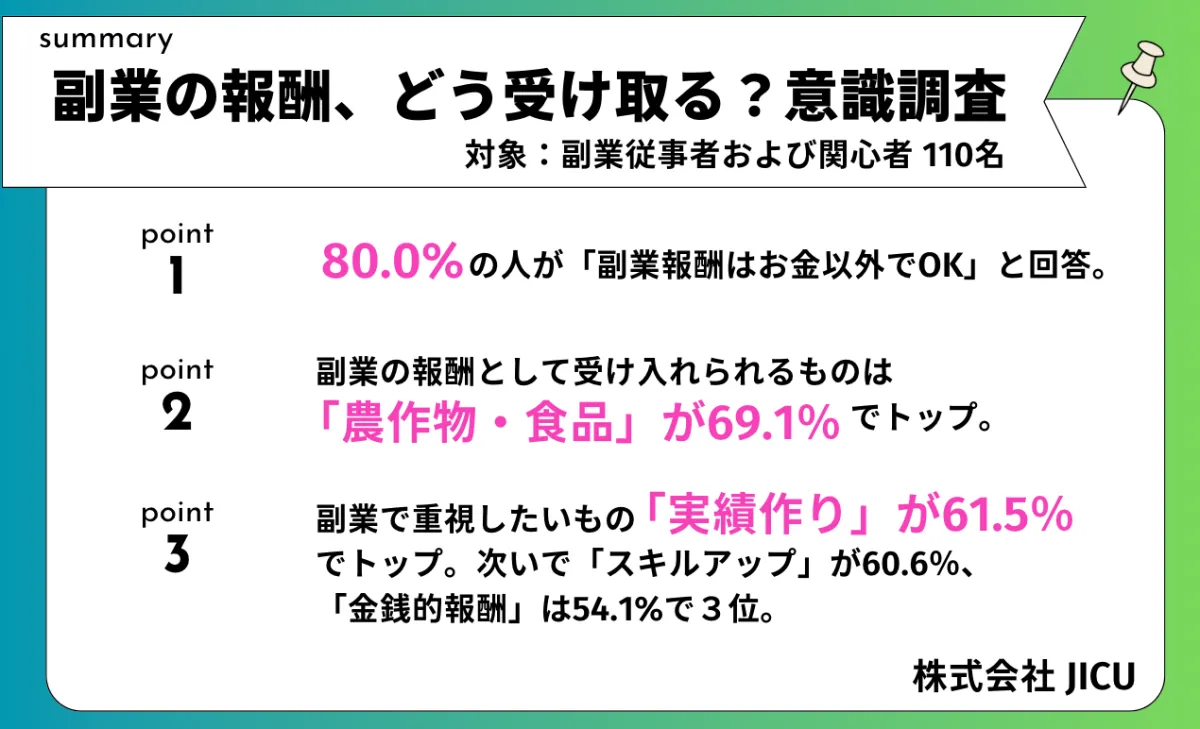 近年、副業に関する認識が大きく変化しています。株式会社JICU(佐賀県鳥栖市、代表取締役:水田侑宏)が実施した意識調査によると、副業の報酬を「金銭以外でも構わない」と答えた人は実に80%に達しました。この結果は、特に農産物やサービス利用権といった現物支給に関する関心の高さを示しています。