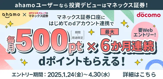 株式会社NTTドコモが提供する「ahamo」のユーザー向けに、特別なキャンペーンが発表されました。このキャンペーンは、マネックス証券の証券総合取引口座と「dアカウント」を連携させたユーザーにお得なポイントが還元されるというものです。キャンペーンは2025年1月24日から2025年4月30日までの期間に実施され、参加者は最大6か月間、毎月500ポイントを受け取ることができます。