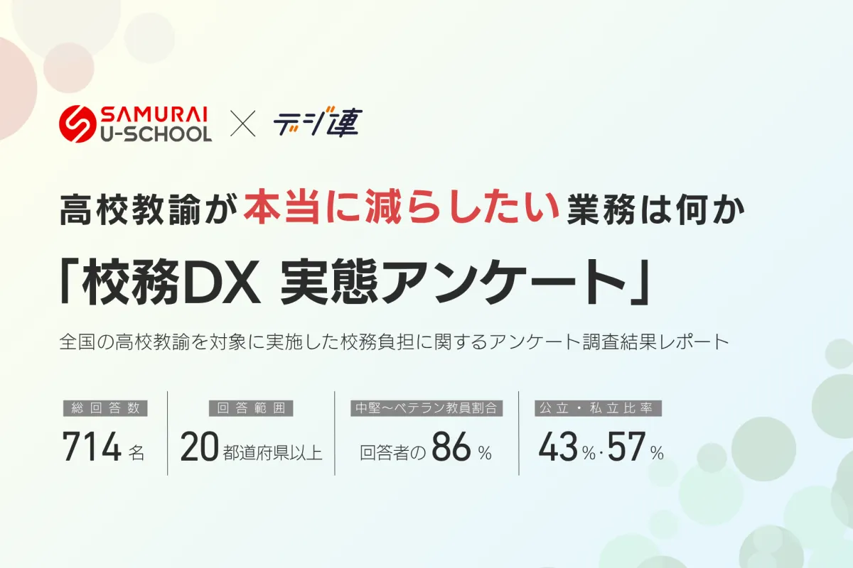 株式会社SAMURAIと一般社団法人デジタル人材共創連盟が共同で実施した「校務に関する実態調査」の結果が明らかになりました。この調査は全国の高校教諭714名を対象に行われ、彼らが抱える業務上の負担や、どのように業務を効率化したいと考えているのかについて探りました。