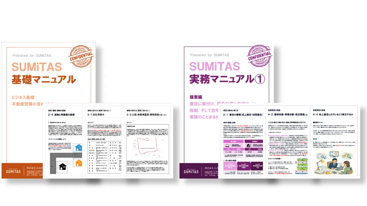 SUMiTASが制作するマニュアルは、まずは不動産仲介の基本的な利益構造を解説し、次に重要な実務判断の根拠をロジカルに説明します。特に、査定時の経済的価値の定義など、通常は言語化が難しい内容を明文化し、経験の少ない新人でもベテランスタッフと同じように説得力のある価格提示ができるように設計されています。