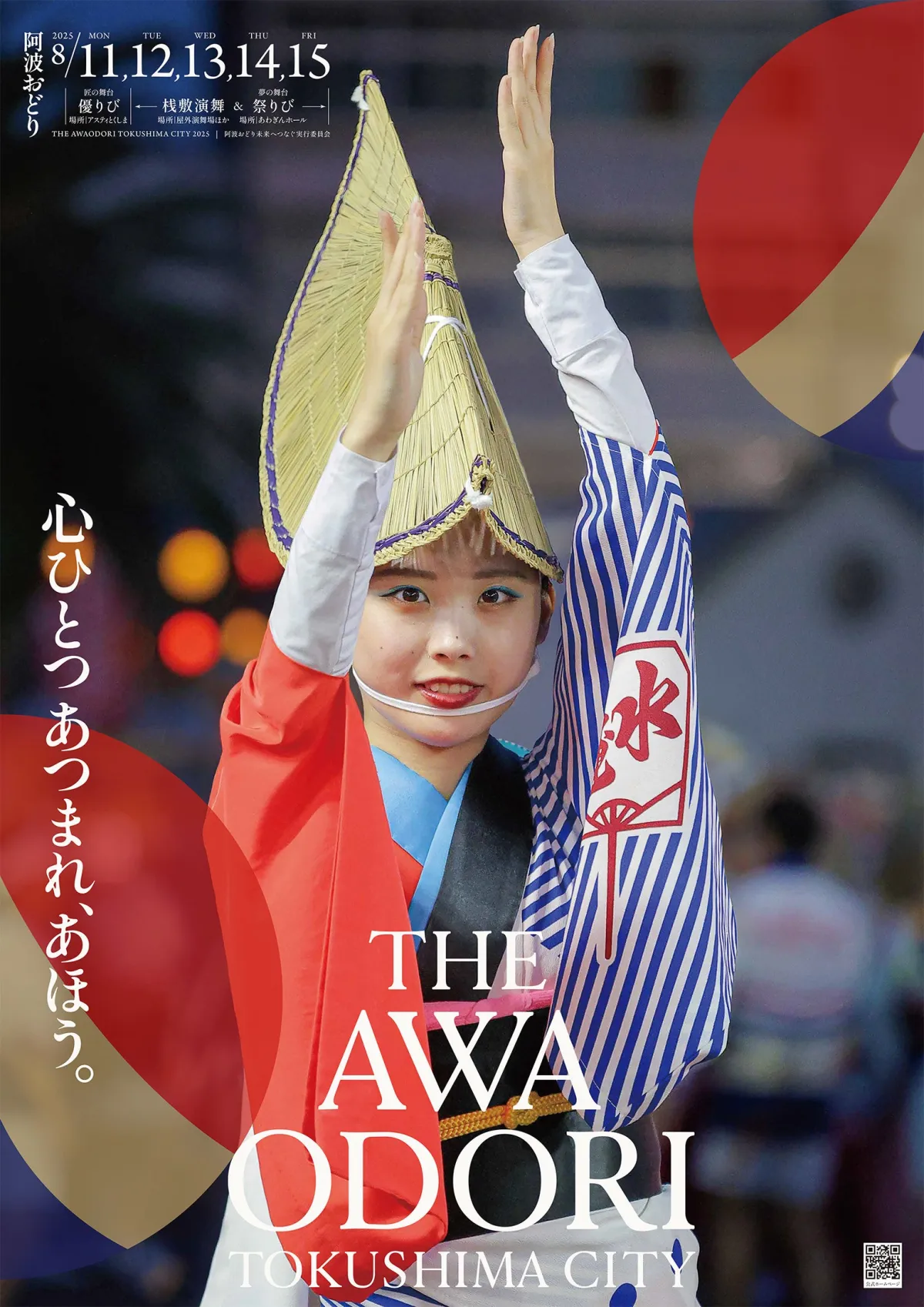 - - 心ひとつ あつまれ、あほう。 これは全体のポスターに使われ、「踊る人も見る人も心を一つに、阿波おどりの熱狂へ!」というメッセージが込められています。